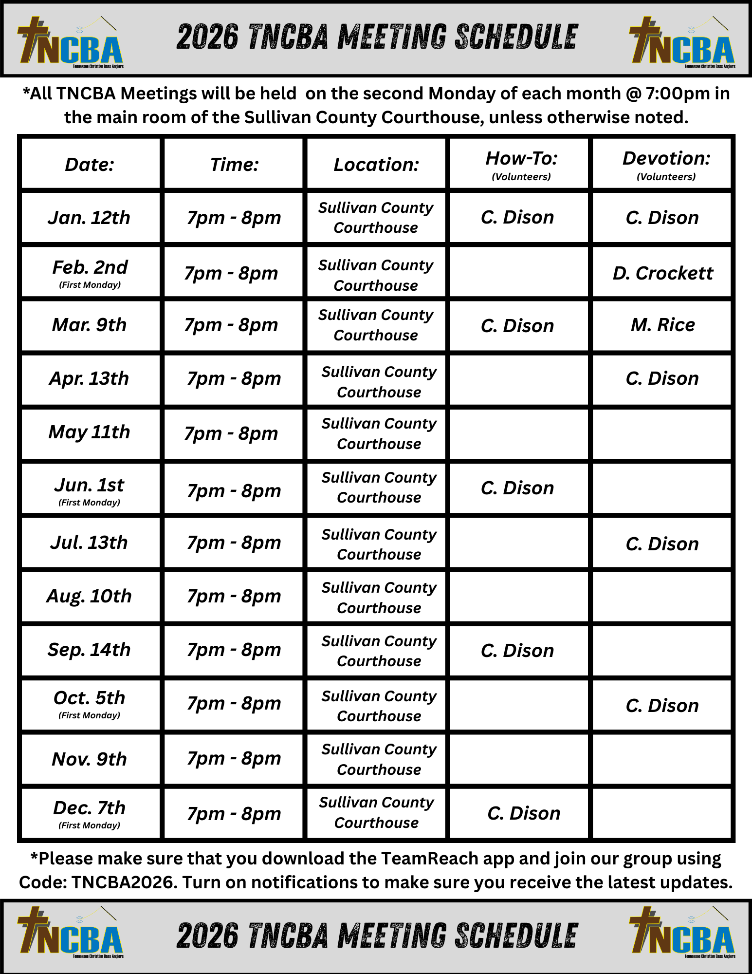 Meetings for the TNCBA take place on the 2nd Monday of every month. (*Unless there is a conflict.) The meetings are held in the Sullivan County Courthouse at 7:00 pm.