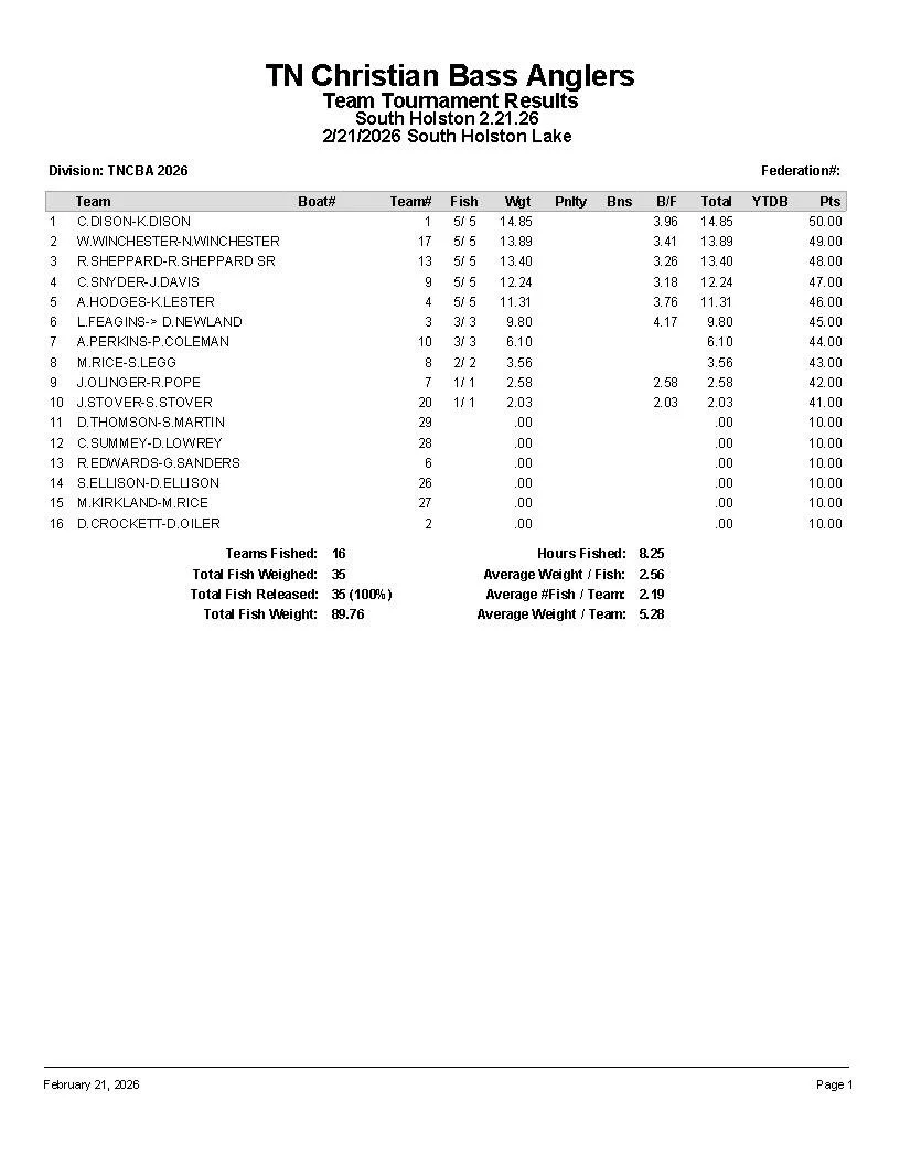 Blountville, TN(423) 833-6254TNChristianBassAnglers@gmail.com
